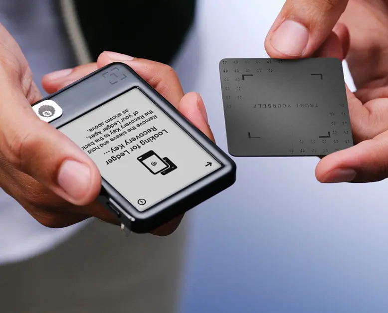 - Ledger Recovery Key (one-time purchase): a PIN-protected NFC card with its own Secure Element that holds an encrypted backup of your 24 words; tap it to any touchscreen Ledger signer to restore instantly.