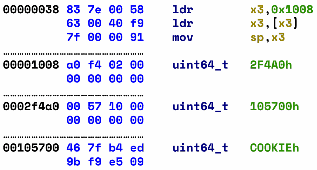 We dug into this data, and to our uttermost surprise, we realised that this was actually a full, linear dump of the whole boot ROM address space, starting from address 0x0. The dump therefore contained all the boot ROM binary (which was indeed mapped at 0x0, as we had hypothesized), but also the dump of the RAM used by the boot ROM during its execution, so that we had essentially a snapshot of the full system state during execution of the READ command. This is not the fault we were aiming for, but it gave us all we needed and more.