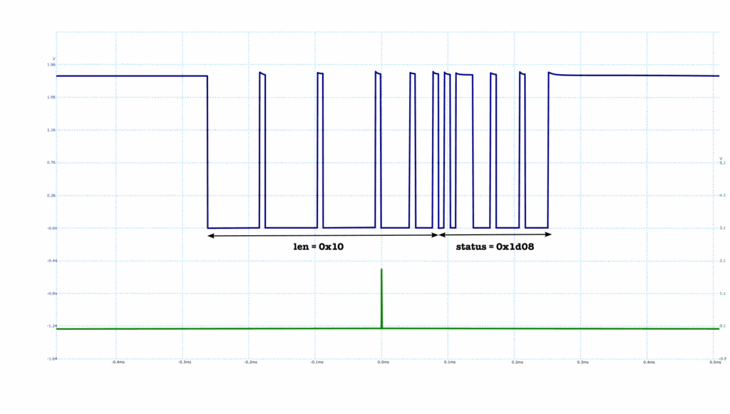 The green trace is the EMFI pulse control from the Scaffold, which controls the release of the EM pulse generated by the SiliconToaster. Here this pulse did not suffice to inject a fault into the processing of the READ command, and we got the regular error status 0x1d08.