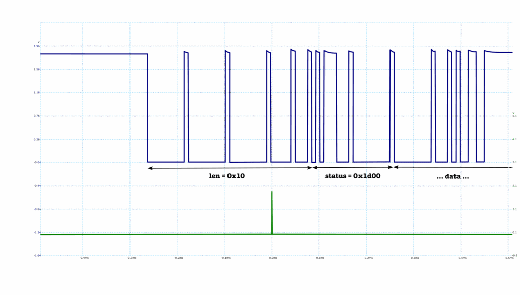 In a bit more detail, the READ command expects us to send it a 4-byte address at which we want to read, and echoes it back to us. It then expects us to send it a 4-byte length, which is the number of words (or half-words – there are actually two variants of the READ command) that we want to read. It, again, echoes this back to us, and then sends a 2-byte status, which is 0x0000 when the read is authorized, and 0x1d08 when it is not. The latter is what we get when we try to read from address 0x0, where we hypothesized the boot ROM might be mapped. Everything in this protocol is always encoded in big-endian. And this is what the echoed length and status look like on the oscilloscope when probing the UART TX line coming from the SoC: