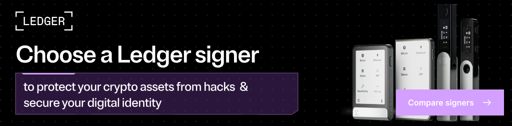 | — A Ledger hardware wallet (signer), combined with the Ledger Wallet™ app, is the best solution to secure, store and manage your crypto assets. — Ledger signers have industry-leading security to keep your crypto and NFTs secure at all times. — With Ledger you can secure, store and manage over 5500+ crypto assets, including NFTs. — Why choose Ledger? Because we offer the best product for keeping your crypto and NFTs safe. |