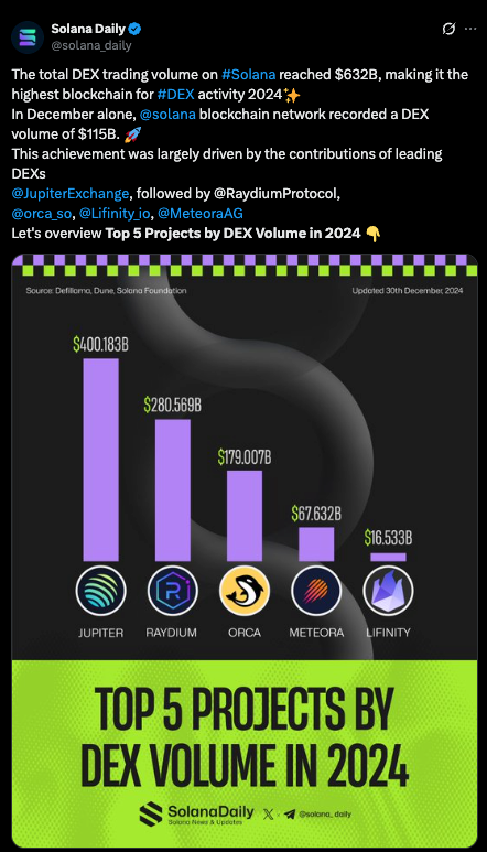 Irrespective of the lack of utility or general inability of most memecoins to hold their value, this phenomenon made clear that Solana was gaining acceptance among retail users. The chain recorded lofty daily transaction values, hitting 66.9M daily transactions by the end of 2024. The network’s monthly DEX volume even surpassed that of Ethereum’s by year’s end, and exceeded $100B in both November and December.