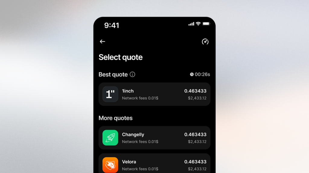 The first design principle: Ledger Wallet should never lock you into a single swap provider. We integrate a wide range of centralized and decentralized providers – Uniswap, 1inch, OKX DEX, Near Intent, ThorChain, Velora, Exodus, Changelly, and more – and we treat this as a marketplace.*