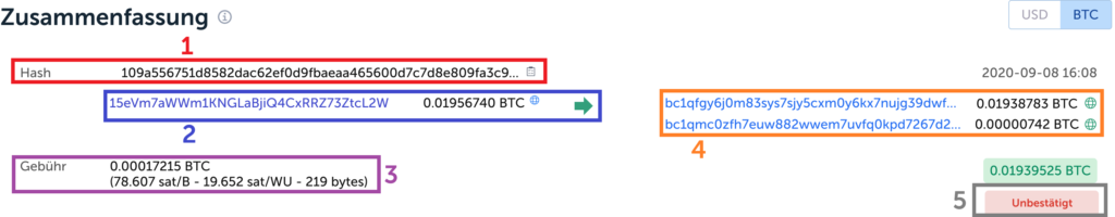 In diesem Abschnitt können wir sehen, welche Adressen das beabsichtigte Ziel einer Transaktion sind. Für jede Adresse können wir sehen, wie viel sie erhalten. Ähnlich wie bei der Absenderadresse können Sie auf die Empfängeradressen klicken, um deren Transaktionsverlauf zu sehen. Die unterste dieser Adressen ist in der Regel die bereits erläuterte Wechselgeldadresse.
