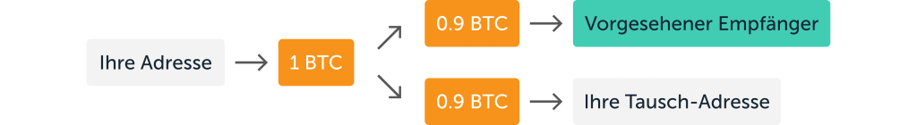 In diesem Beispiel hat Ihre Adresse ein Guthaben von 1 BTC. Sie möchten 0.1 BTC an einen Freund schicken. Wenn Sie eine Transaktion erstellen, senden Sie den gesamten Betrag, der in Ihrer Adresse vorhanden ist. Natürlich geht dieser Betrag nicht komplett an Ihren Freund. Ihr Freund erhält die 0,1 BTC wie vorgesehen. Die restlichen 0,9 BTC werden an Ihre Wechselgeldadresse zurückgeschickt. Diese Adresse ist vollständig unter Ihrer Kontrolle. Dies ist einzigartig für Bitcoin und seine Derivate – Ethereum und XRP würden zum Beispiel nicht das gesamte Guthaben einer Adresse verschicken.