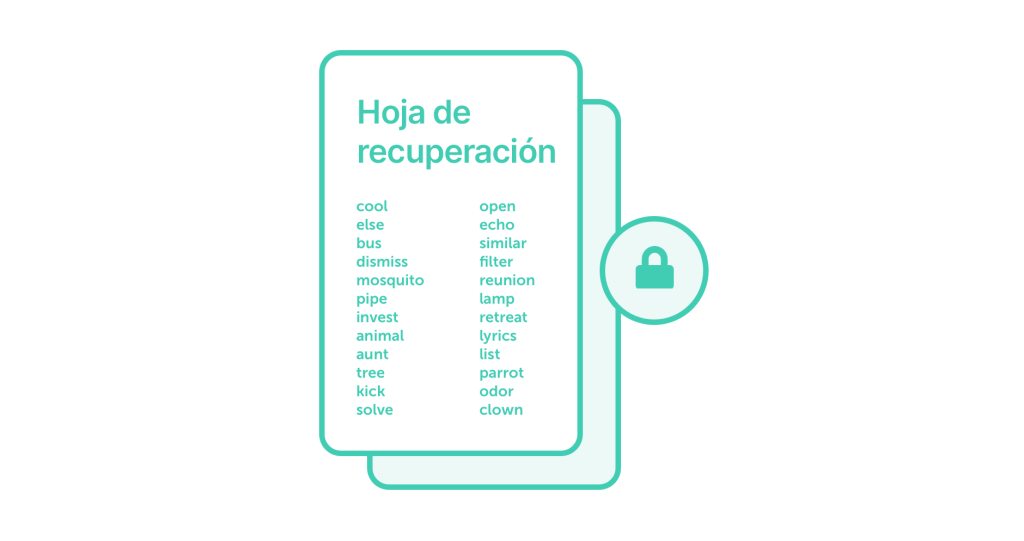 Al inicializar tu billetera de hardware por primera vez, se te pedirá que anotes 24 Palabras en una Hoja de recuperación. Estas 24 Palabras se llaman Frase de recuperación y son una copia de respaldo en lenguaje natural de la que se derivan todas tus claves privadas. Se utilizan para restaurar el acceso a tus activos cripto en otro dispositivo Ledger o en cualquier otra billetera compatible.