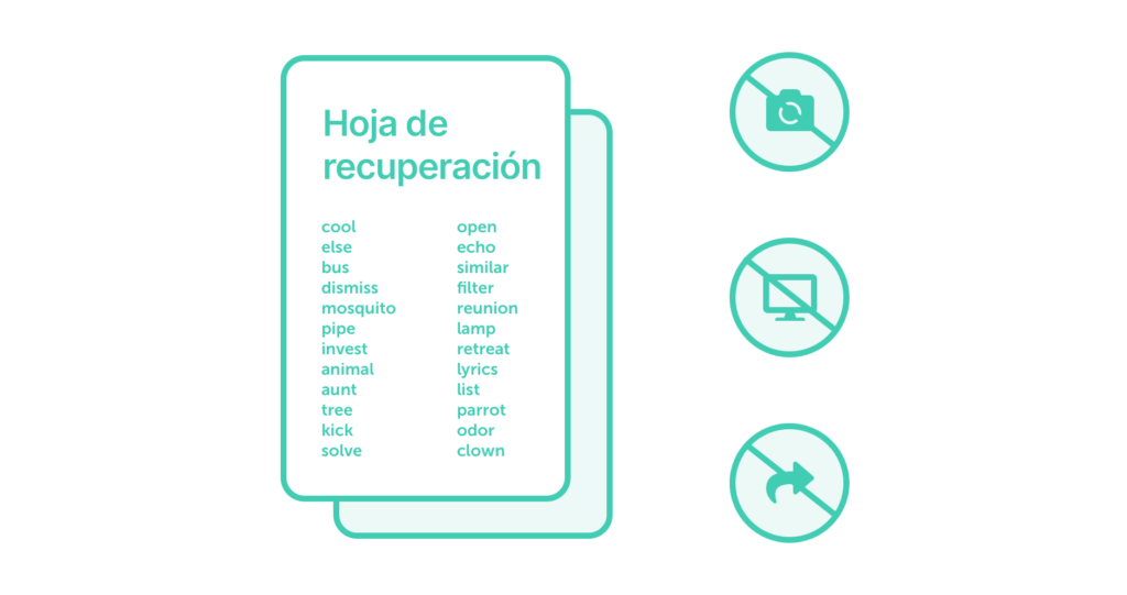 - No guardes tu Hoja de recuperación en una caja fuerte en casa. La bóveda de un banco es mucho más segura. Si no tienes acceso inmediato a tu copia de respaldo, aumentará tu resiliencia a las amenazas físicas.
