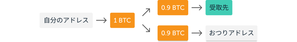 例えば、アドレスに1 BTCの残高があるとしましょう。 0.1 BTCを友人に送りたいと仮定します。 トランザクションを作成すると、アドレスの全残高が送信されます。 もちろん、これがすべて友人に渡るわけではありません。 意図した通り、お友達には0.1 BTCが届きます。 残りの0.9 BTCは、おつりアドレスに送られます。 このアドレスをコントロールするのは、あなたです。 これは、Bitcoinと派生コインに特有の特徴となります。例えば、EthereumやXRPでは、アドレスの残高をすべて送信することはありません。