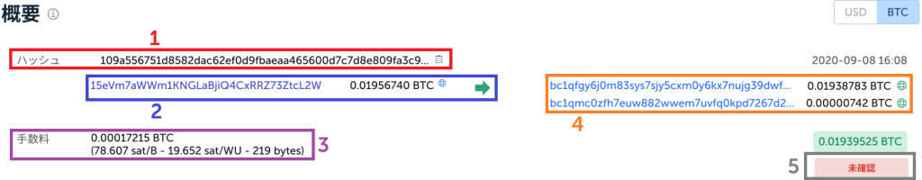 このセクションでは、トランザクションの宛先アドレスを確認できます。 各アドレスごとに、どれだけの金額を受け取っているかがわかります。 送付元アドレスと同様、受信側のアドレスをクリックするとトランザクション履歴を見ることができます。 通常、こうしたアドレスの一番下にあるのが、おつりアドレスです。