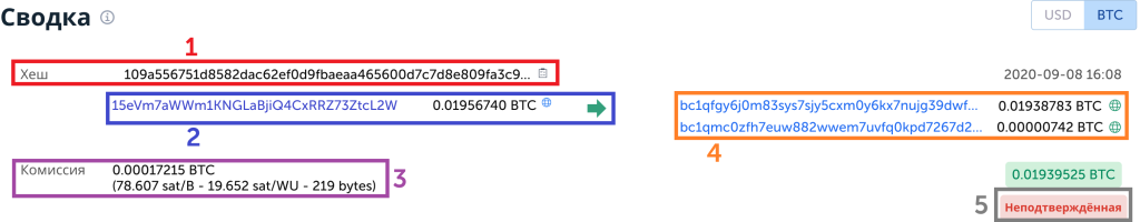 В данном разделе указывается адрес, который является конечным пунктом назначения для транзакции. При этом напротив каждого адреса отображается сумма, предназначенная для него. Как и в случае с адресом отправителя, здесь можно нажать на адрес получателя, чтобы увидеть историю его транзакций. Обычно в нижней части таких адресов указан уже упомянутый адрес для сдачи.