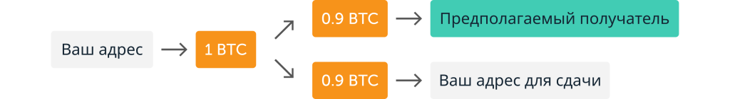 При проведении транзакции в Биткойне вы автоматически отправите полный объём монет с вашего адреса, после чего соответствующий остаток криптовалюты вернётся на ваш адрес для сдачи. Давайте ознакомимся с примером.