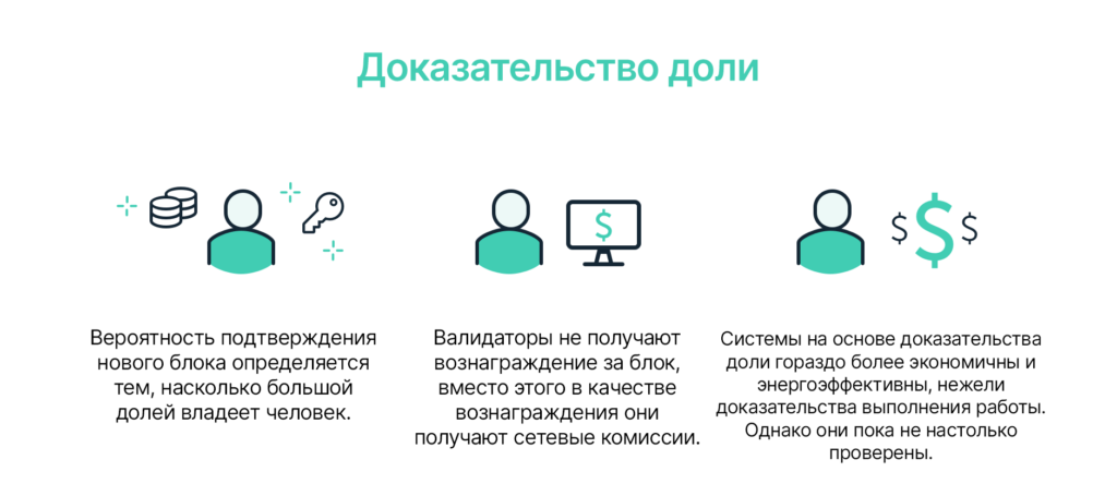 У алгоритма Доказательства доли владения есть несколько любопытных составляющих. Прежде всего, поскольку PoS предполагает наличие финансового поощрения в виде вознаграждения, данный алгоритм консенсуса не нуждается в ресурсоёмком соревновании вычислительных мощностей с элементами лотереи. Оно свойственно Доказательству выполнения работы или PoW. Это сказывается на производительности и безопасности таких блокчейн-сетей.