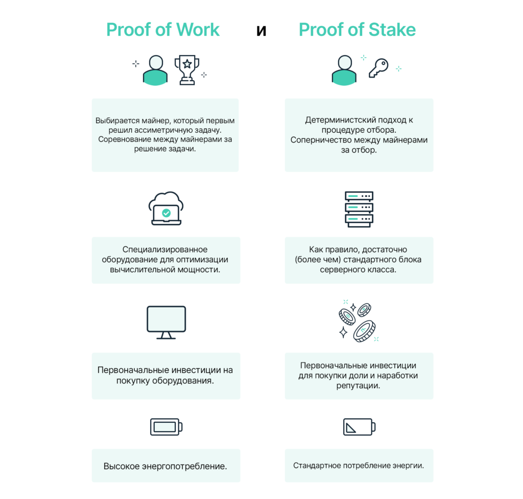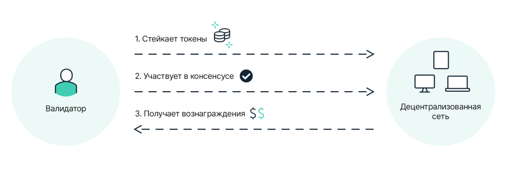 | — Стейкинг — это процедура блокировки криптоактивов. Она обеспечивает безопасность блокчейн-сети, а также позволяет получать вознаграждение. — Доказательство доли владения — это алгоритм консенсуса. Он определяет, кто из валидаторов будет подтверждать следующий блок в блокчейн-сети, с учётом объёма их монет в стейкинге. Именно это отличает данный алгоритм от Доказательства выполнения работы (PoW), который предполагает разгадывание майнерами криптографических головоломок с помощью вычислительного оборудования для подтверждения транзакций. — Алгоритм Доказательства доли владения активно поддерживается многими представителями блокчейн-индустрии. Вдобавок он способен обеспечить повышенную устойчивость блокчейн-сетей. |