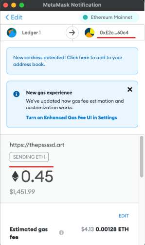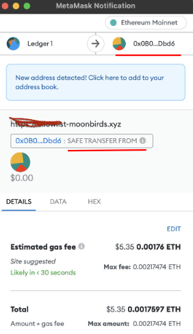 Bu bariz bir tehlike işaretidir: Mint’leme yapıyorsanız aktarma için değil “mint’lemek” için olan bir fonksiyon çağrısı görmelisiniz. Bu durumda işlemde net bir şekilde bir transfer görünür. Ayrıca NFT, bir Ledger cüzdanından başka bir cüzdan adresine taşınıyor. Yani cüzdanınız NFT almak yerine bunu gönderiyor.