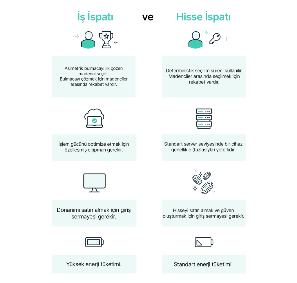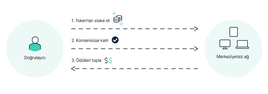 | — Staking, ağı güvenceye almak için kripto varlıkları kilitleme ve bunun karşılığında faiz ödemesi alma eylemidir. — Hisse İspatı (Proof of Stake; PoS) bir sonraki bloku kimin doğrulayacağına karar veren bir konsensüs algoritmasıdır. Geleneksel olarak kullanılan İş İspatı (Proof of Work; PoW) algoritmasında madenciler işlemleri onaylamak adına cihazlarının işlem gücünü kullanarak kriptografik bulmacaları çözerken, PoS algoritmasında doğrulayıcılar ellerinde tuttukları coin miktarına bağlı olarak seçilir. — Sektör genelinde birçok uzmanın desteğini alan Hisse İspatı daha yüksek seviyede sürdürülebilirlik sunar. |