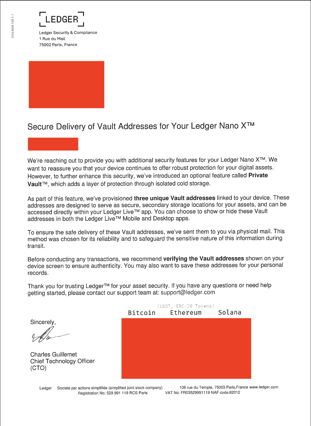 Yakın zamanda gönderilen başka bir mektupta ise Ledger’ın belirli kullanıcılar için vault adresleri açtığı iddia edilmektedir. Doğrudan ifade edilmese de kriptolarınızı “vault’lamak” (kasada saklamak) için çeşitli cüzdan adreslerine fon göndermeniz gerektiği ima edilmektedir. Bu elbette doğru değildir ve bilmediğiniz bir adrese asla kripto para göndermemeniz gerekir.