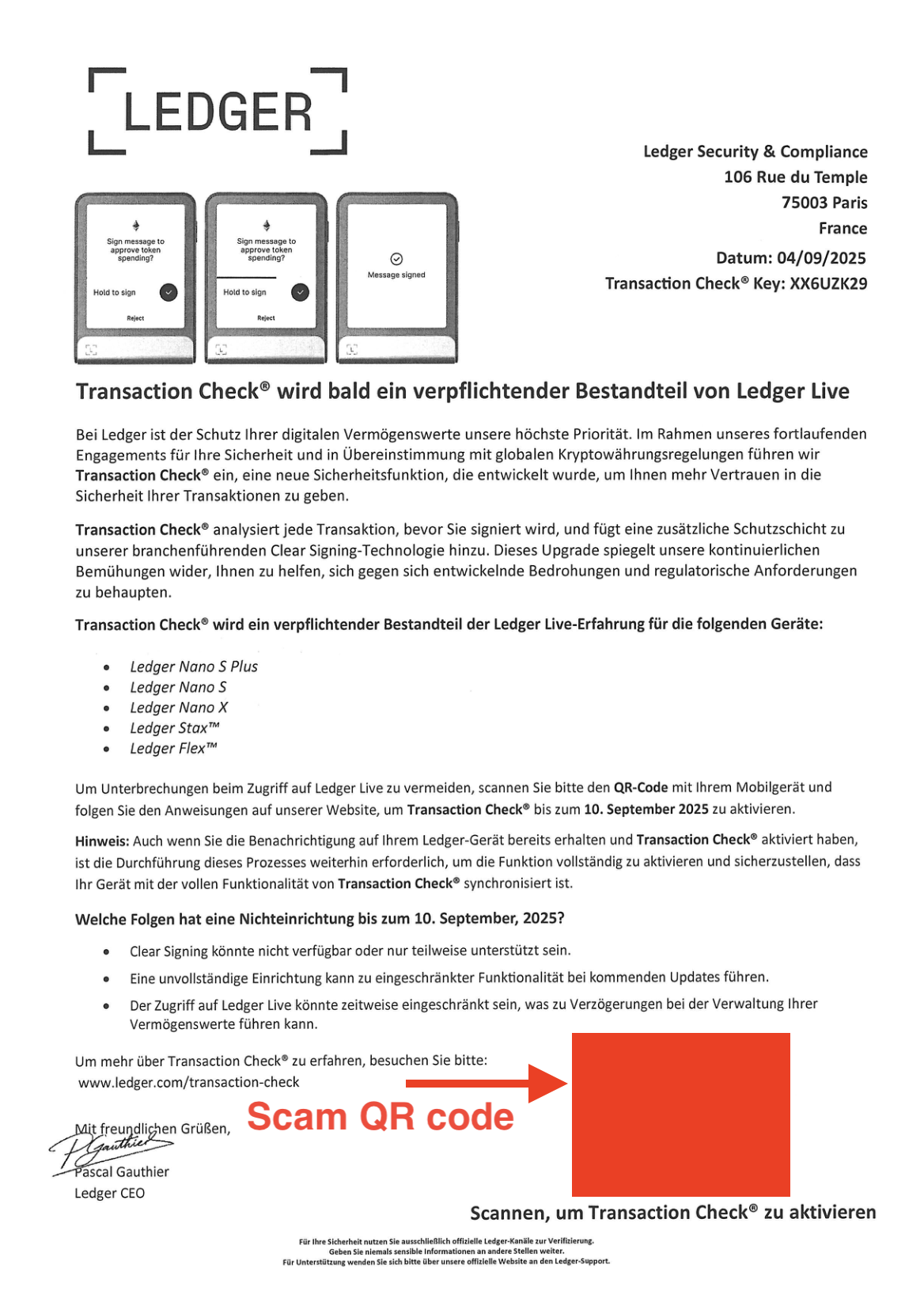 Kullanıcılar, posta yoluyla fiziksel mektuplar almaktadır. Mektupların formatları ve içerikleri değişiklik göstermekte, ancak hepsinde kişilerden bir karekodu tarayıp ve/veya mektupta belirtilen web sitesine gidip verilen yönergeleri uygulamaları istenmektedir. En sonunda da kullanıcılardan 24 kelimelerini girmeleri istenmektedir. Unutmayın: 24 kelimenizi hiçbir zaman girmeyin. Kurtarma ifadenizi bir bilgisayara girmeniz için geçerli hiçbir neden yoktur. Kurtarma ifadenize sahip olan kişiler, bu ifadeyle oluşturulan tüm hesaplara tam erişim sahibi olur.