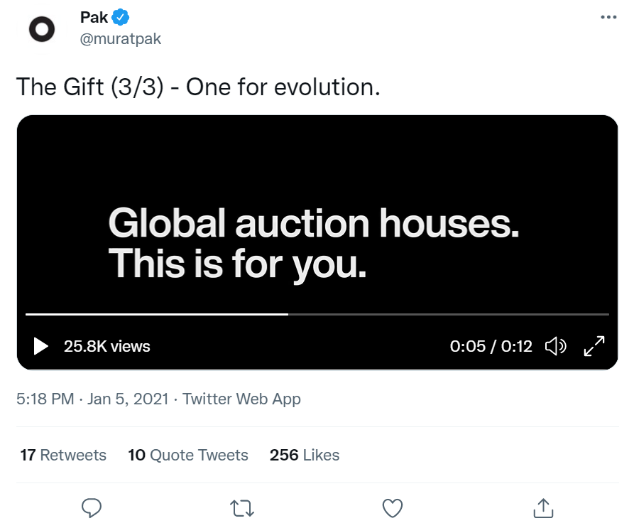 Pak 与拍卖巨头苏富比合作于 4 月发布了其最著名的艺术收藏品。 这一切始于 Pak 在 Twitter 上召集多家拍卖行,并表示要送出一份礼物。
